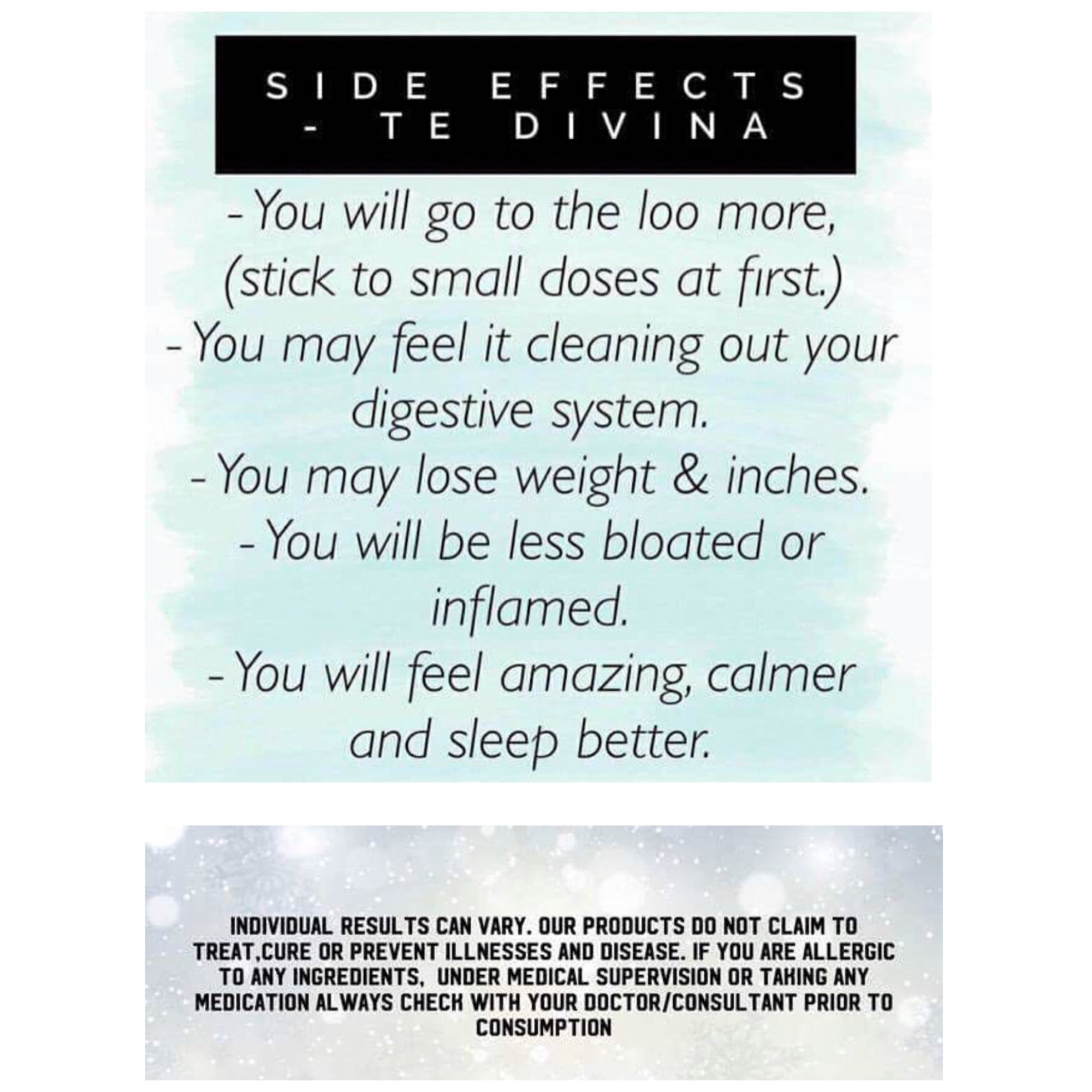 Te Divina Detox Tea is a safe, gentle cleansing tea. So if you do not already have regular bowel movements, the initial cathartic effect of the tea may cause bloating, mild stomach upset, loose stools, and diarrhea. However, once you have achieved bowel regularity, these conditions will lessen or go away completely.