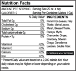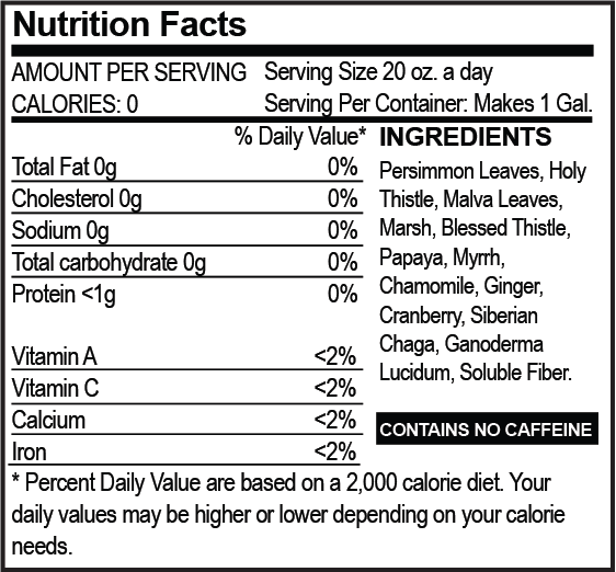 Persimmon Leaves, Holy Thistle, Malva Leaves, Marsh, Blessed Thistle, Papaya, Myrrh, Chamomile, Ginger, Cranberry, Siberian Chaga, Ganoderma, and Fiber.